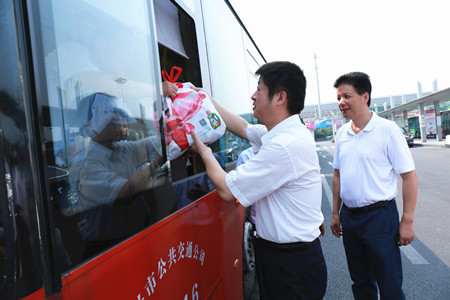 7月28日上午,祝亞偉副市長一行深入基層,向冒著高溫酷暑堅守在工作崗位上的公交一線員工表示感謝和慰問,并送上防暑慰問品和慰問金。集團公司董事長沈蘭冠、公交公司相關負責人陪同慰問。